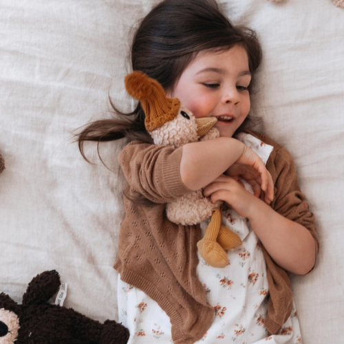 Made with our unique cotton plush fabric, Petunia has her own style and keeps warm in her Australian merino wool knitted beanie She loves ice-cream sundaes and collecting everything eating watermelon in summer and playing on her swings She doesn't like spinach!